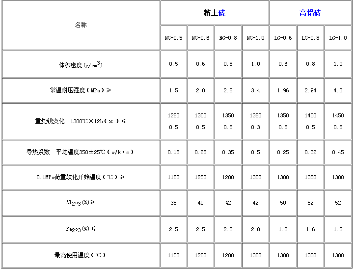 ?耐火磚的特性:以先進(jìn)獨(dú)特的工藝制造的粘土、高鋁隔熱磚,耐壓強(qiáng)度高,熱穩(wěn)定性好,價(jià)格低廉。主要用途:適用于砌筑工業(yè)窯爐以及其它熱工設(shè)備的隔熱層及爐內(nèi)襯,減少了爐墻的熱容量,提高了窯爐和熱效率。理化指標(biāo)方面有什么區(qū)別,請(qǐng)看下列圖表: